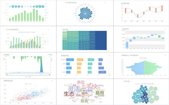 • 數(shù)十種的可視化圖表效果,包括柱形圖、折線圖、雷達圖、散點圖和詞云圖等,滿足不同人群的閱讀偏好,為您展示多樣數(shù)據(jù)信息提供全面支持