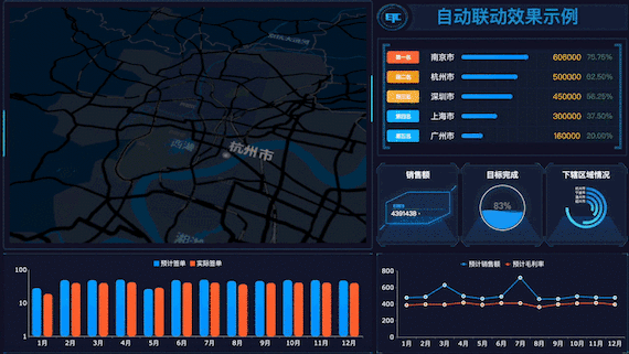 • 支持業(yè)務(wù)互動,包括不限層次的鉆取、多維度的聯(lián)動分析、輪播時自動聯(lián)動其他組件等,協(xié)助您更好的發(fā)現(xiàn)并分析業(yè)務(wù)問題