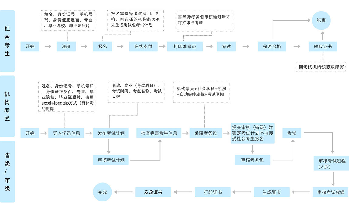 智慧考試系統(tǒng)主要是由考生端、考試端、機構(gòu)端、監(jiān)管端、管理端等組成,對線上考試進(jìn)行綜合管理的系統(tǒng)平臺。該平臺將考生培訓(xùn)、報名、繳費、考試安排、考務(wù)管理等考試流程信息統(tǒng)一管理,并從各個維度幫助企業(yè)立體化分析考生考試等數(shù)據(jù),極大提升了考試流程的規(guī)范化、標(biāo)準(zhǔn)化、信息化,提升了考試效率,提升了考生的考試體驗。